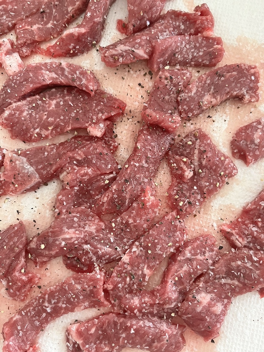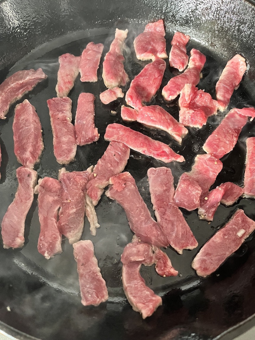 - Preheat a large cast iron skillet over medium high heat. Pat dry the beef slices and season with salt and pepper.