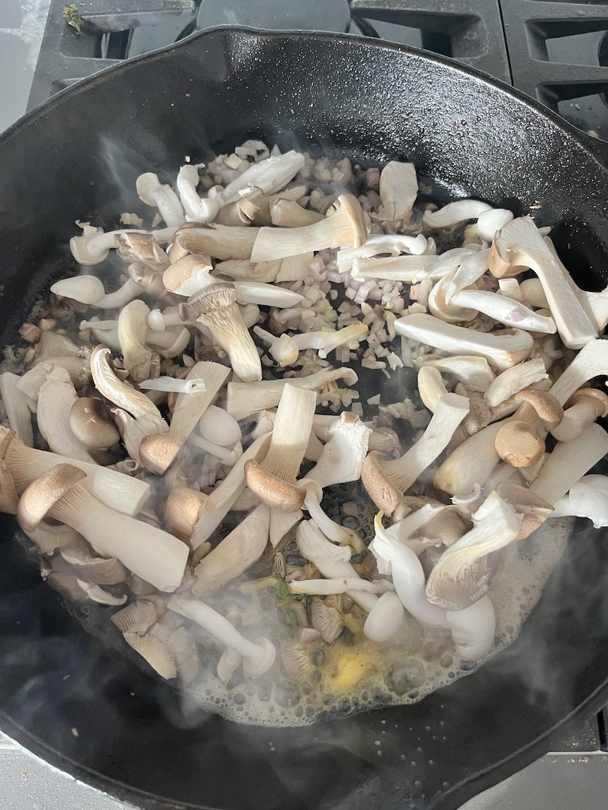 - Add the butter, mushrooms, shallot and garlic to the pan and stir to combine. Cook for 2-3 minutes.