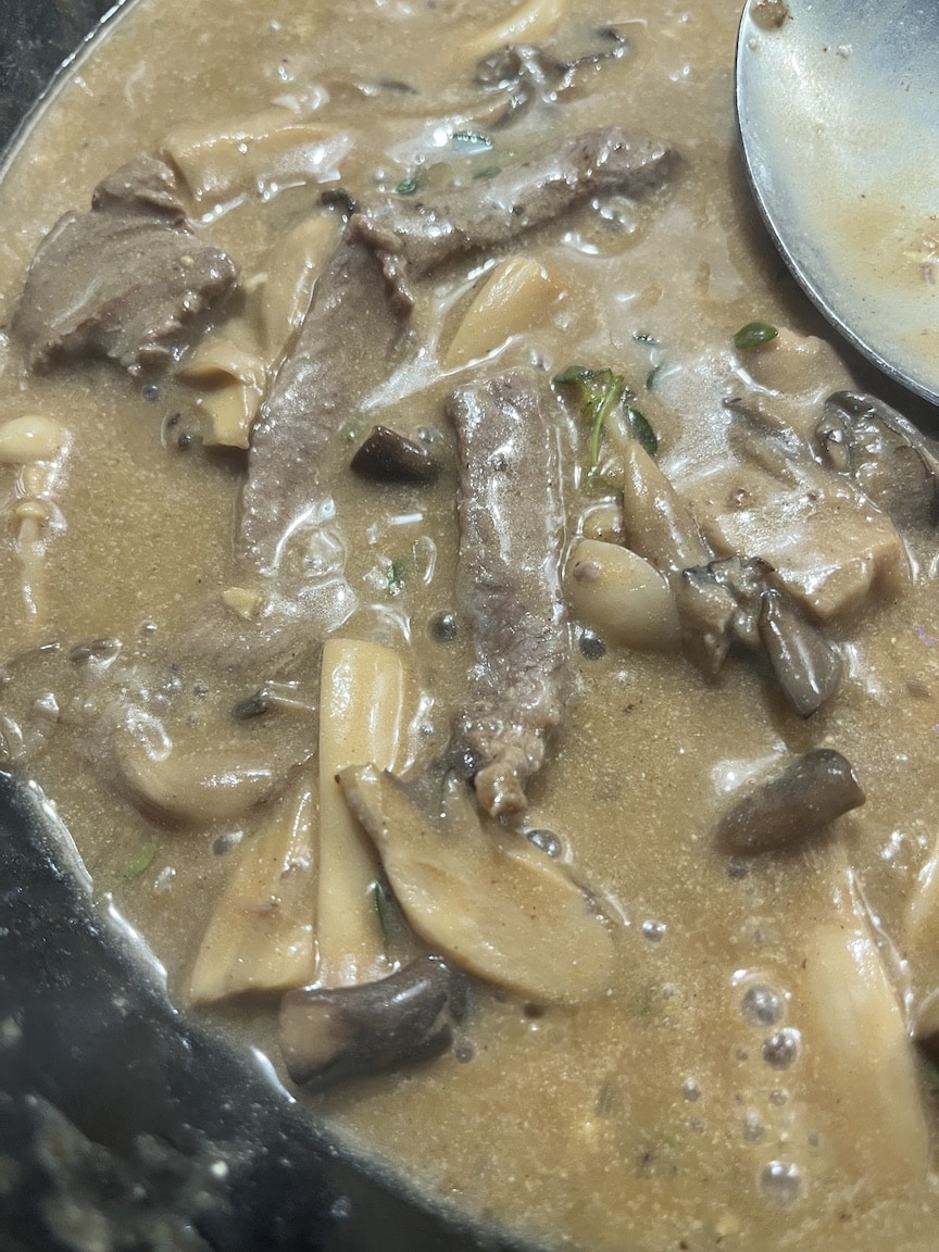 The delicious, velvety sauce is made with thin sliced beef, a variety of mushrooms and aromatics such as garlic and shallots.