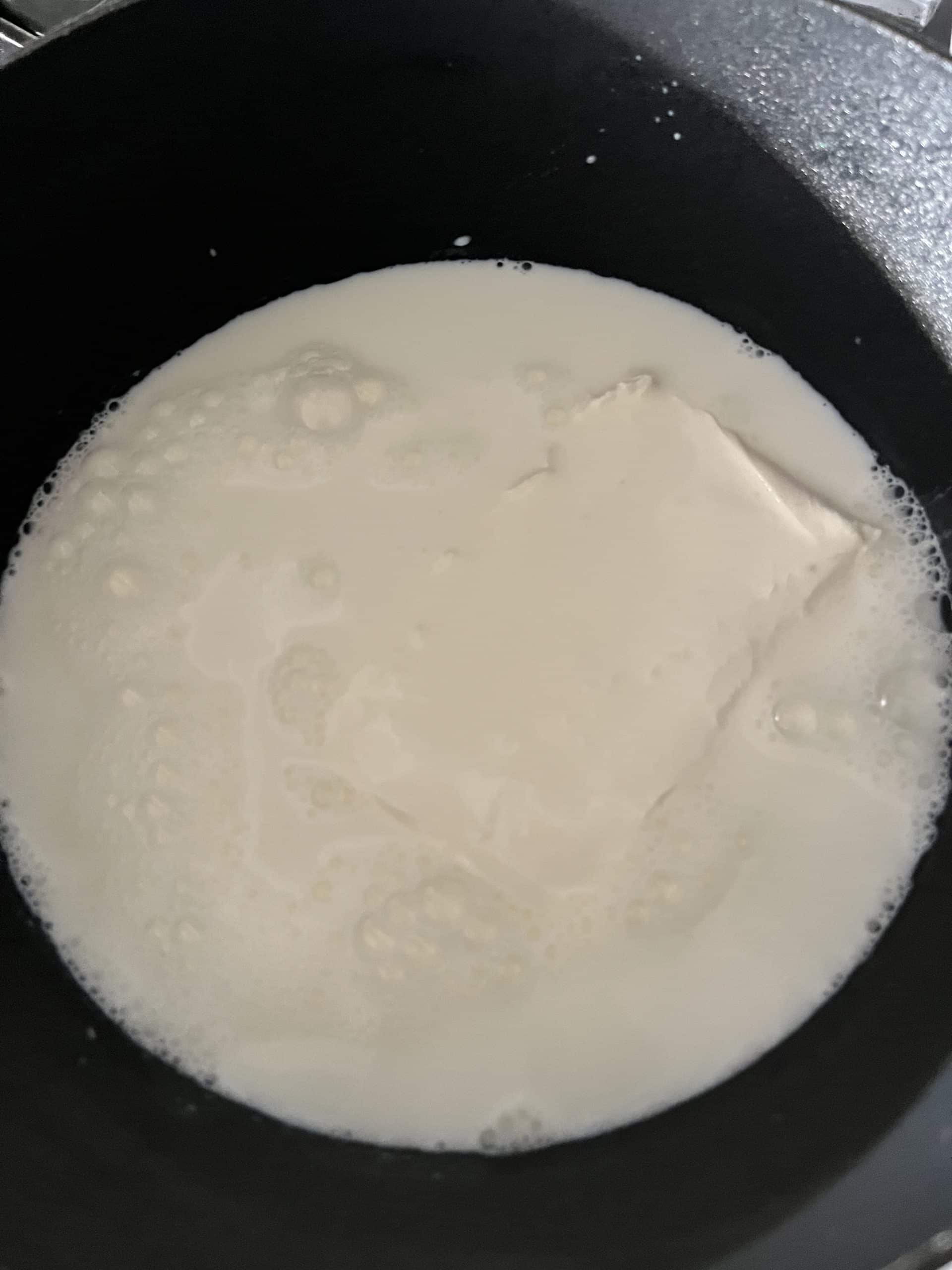 3. Place the milk and cream cheese in a saucepan over medium heat. Stir until cream cheese is melted.