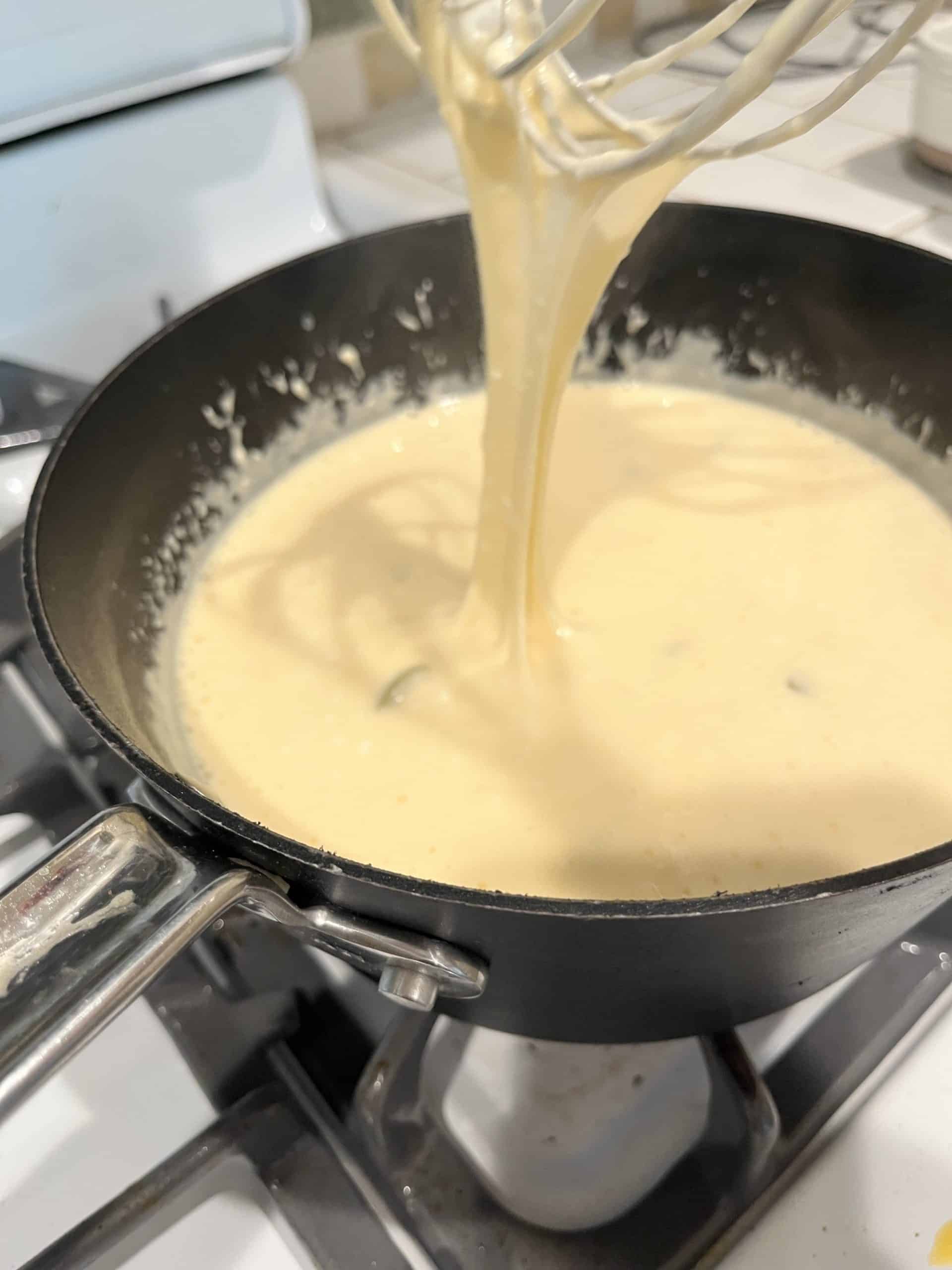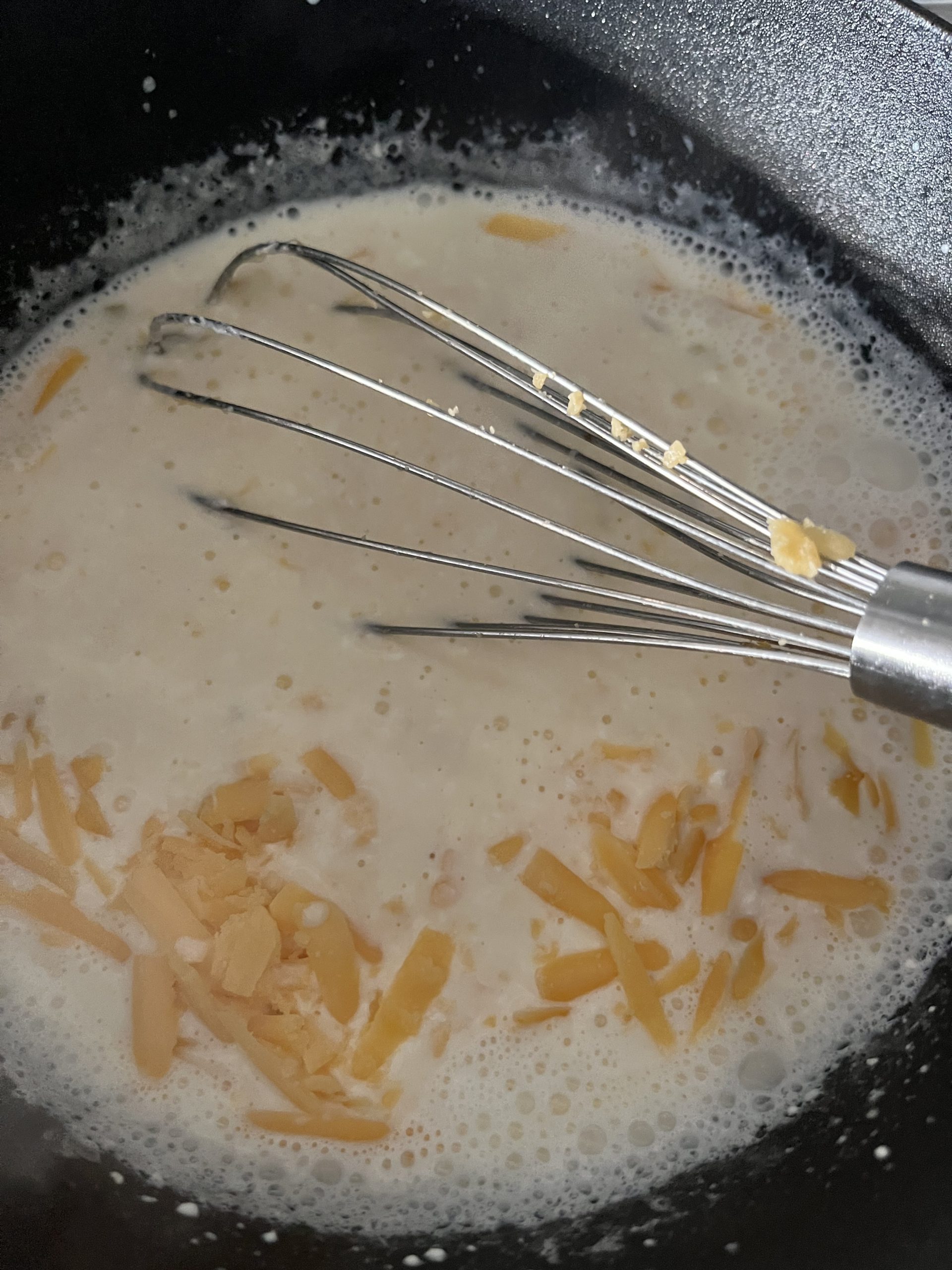 4. Whisk in cheddar cheese and queso quesadilla cheese.